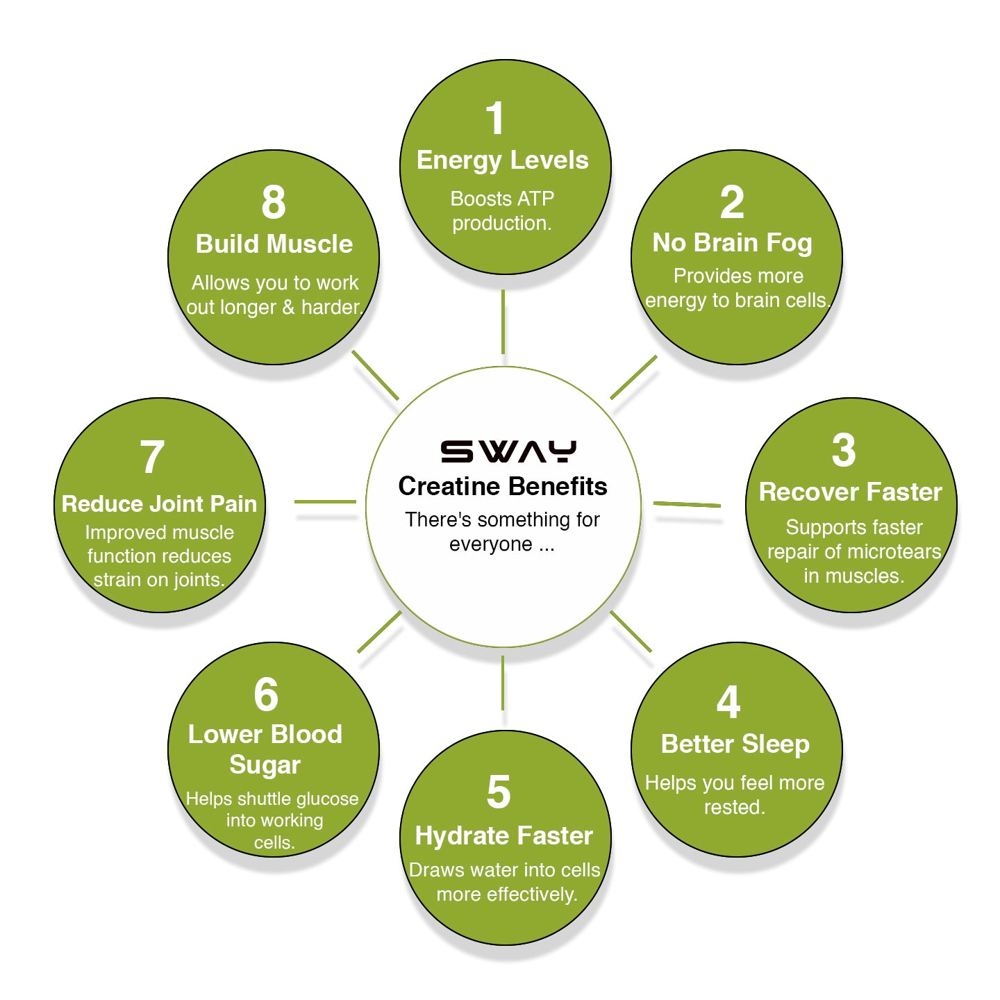 Creatine supports mental clarity and cognitive function, especially under stress or lack of sleep.